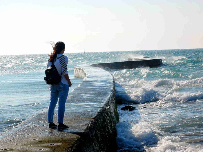 吃完早餐走~往北環路線出發,開始尋找澎湖的新秘境,第一站來到後寮「天堂路」往海中延伸的碼頭,配上澎湖的東北季風拍起照來格外有感覺,在走碼頭時請小心,不要滑倒囉!
