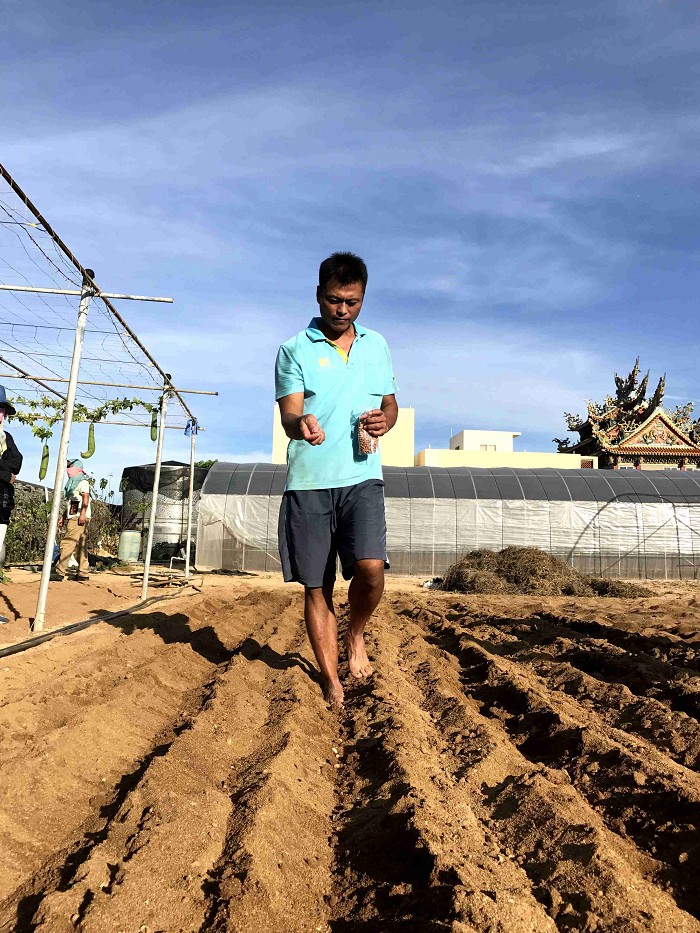 犁出長長的溝後,開始種花生囉,把花生等份的放在溝中間,接著用腳踢呀踢的好像在跳踢踏舞似的,把花生埋起來囉~~會被麻雀吃掉還是可以順利長大呢?半年後見真章!