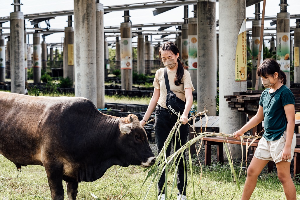 協會發揮巧思,在架高約3公尺的光電板下,放牧台灣原生黃牛,讓黃牛擔任自然除草的幫手,就不必為了除草而噴灑除草劑造成環境、生態負擔,牛隻排遺則可飼養蚯蚓,再利用蚯蚓製造出的健康土壤栽種蔬菜和香草,如迷迭香、芝麻葉、番茄等,形成一個友善循環,實踐綠色農村循環經濟。