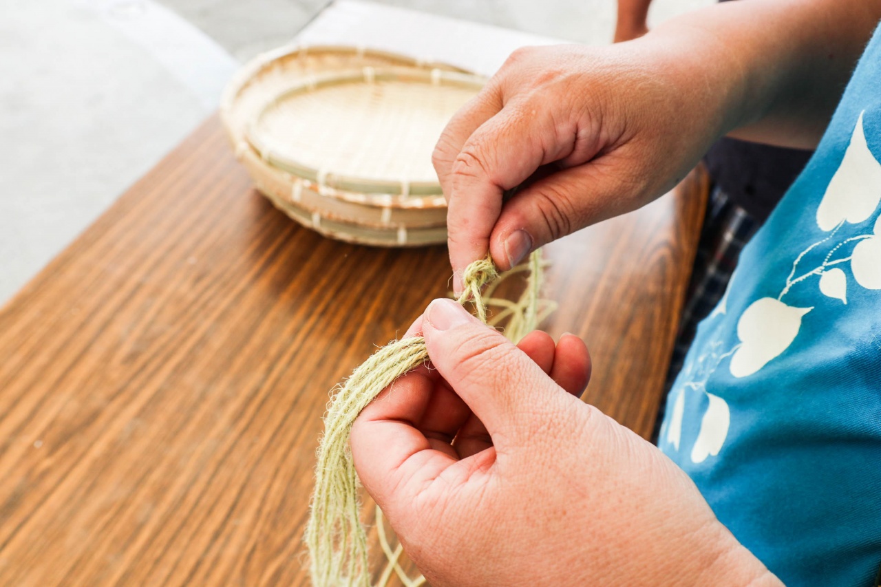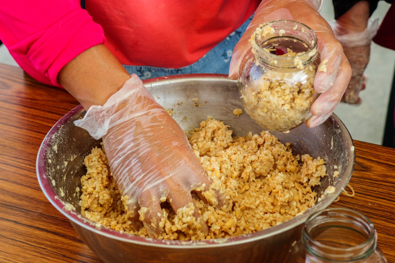 之後再將準備好,比例正確的鹽以及米麴攪拌均勻並且裝罐完畢,後續常溫下等待發酵。除了製作味噌外,主持人還教導我們他們簡單的編織手法,可以做為小手提袋裝著甜酒釀或是味噌,在兼具功能性的同時也很美觀。看著不論年紀長幼、男女老少大家都非常專注在各自的編織作品上,讓人感嘆文化的傳承真的需要所有人的支持與投入,才能有更好的效果。