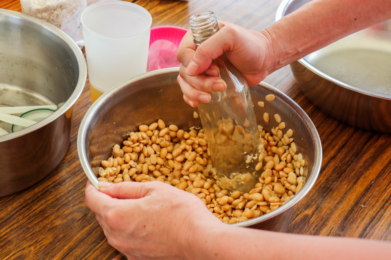 在最後一天的活動中,主持人拿出了幾顆不同顏色的豆子詢問我們各種顏色分別是什麼豆。大部分的年輕人都只能說出紅豆、綠豆和黑豆,稍微年長的幾位遊客能說出黃豆,也正是這次體驗的主角,味噌。在部落中,味噌是透過浸泡過的黃豆加以蒸煮,使黃豆軟糯且膨脹飽滿。由於味噌對於菌類很敏感,製作過程需要將器物殺菌,且雙手必須用酒精消毒才能進行。雙手消毒後大家會戴起手套,一開始都還不知道這一步驟是為了什麼,只是覺得整個體驗非常細心仔細的準備。