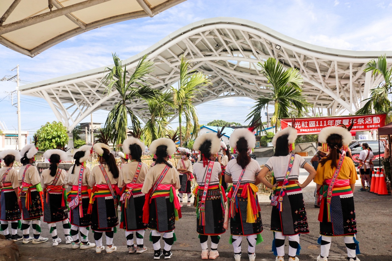回程後,也剛好是長光部落豐年祭的開始,族人們在廣場中央圍成兩個大圈,一圈是男生,一圈是女生,並且按照部落年齡階級依序排列。做特別的是,原本我以為所有族人都依照階級穿著統一的族服,仔細一看才發現所有人身上的配件、頭飾花色都不一樣。詢問一旁的主持人才知道,所有人身上的族服都是自己手工製作出來的,編織所使用的花紋也是遵循嚴格的階級制度,在此限制之上再做各自的創新,如此一來大家看起來是一個部落的群體,但仔細一看大家都是獨立的個體,每個人身上的花紋和配件在深入了解後都會有他的故事。