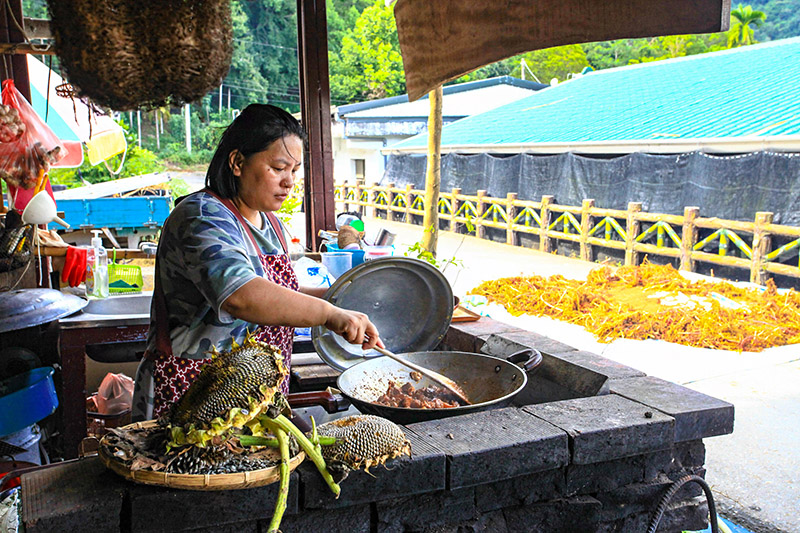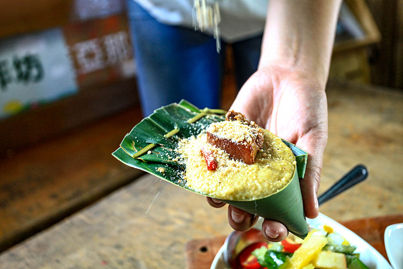 用月桃葉作為食器,盛上一匙黃澄澄的小米飯,搭配加入小米酒釀的招牌滷肉,灑上一些花生粉,敢吃辣的再配一根自製的朝天椒,可是每一次慢食市集都大排長龍的人氣小米飯,現在想起來還是口水直流!