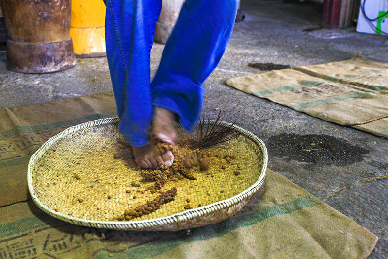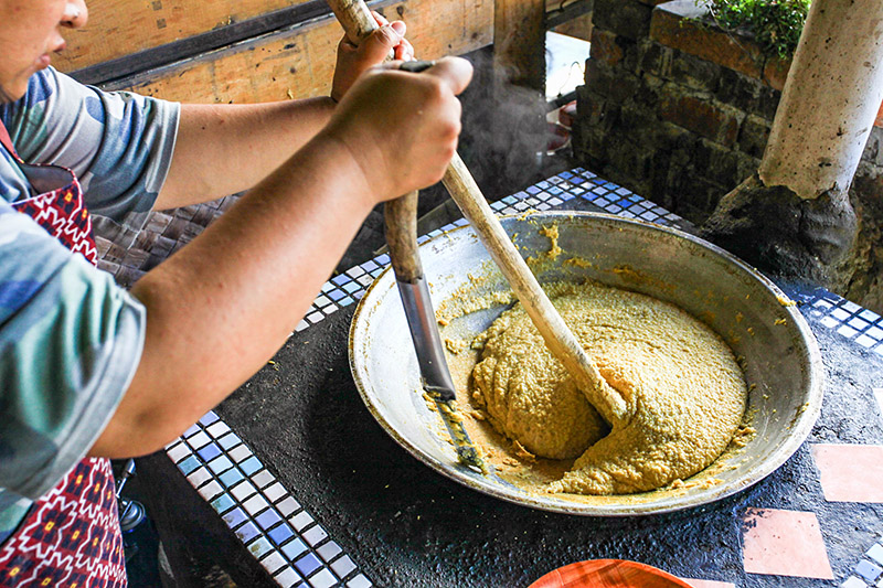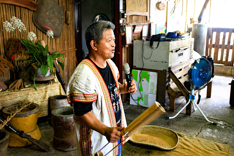 小米是完全仰賴體力的活,經雙腳搓揉使小米脫粒後,再以搗杵敲擊使穀殼脫落,然後以竹篩輕輕翻起,讓風吹走小米殼,才能留下細小鵝黃色的小米粒。