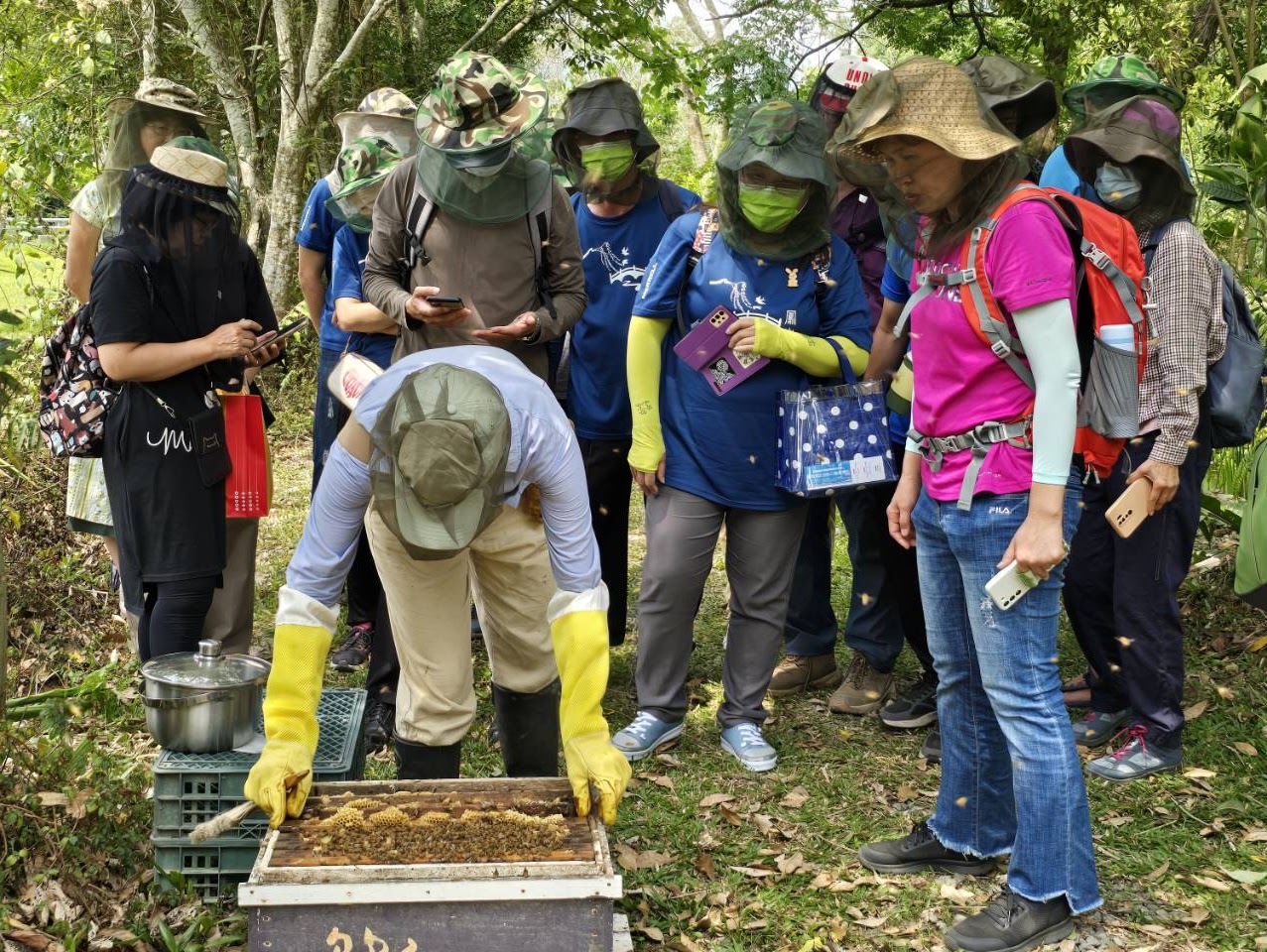 「你找得到面天樹蛙嗎?還有,黑蒙西氏小雨蛙又在哪裡?」,最讓人心喜的是,全臺有卅多種青蛙,在多多鳥的生態池就能找到十五種,還有生機盎然的蜂箱,如今的她能從容起拿起蜂巢板解說蜜蜂的一生。