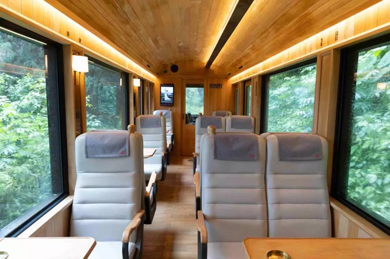 福森號車廂以台灣特有種紅檜及扁柏木材打造天然低調窗框,並採用穹頂式設計,打造出開闊的空間與視覺感受。 福森號將乘載著嘉義在地體驗及阿里山的美好,搭配全新獨家路線來打造林鐵全新的優雅奢華體驗。福森號車廂兩側柔和的燈光點綴,突顯實木獨有的溫潤氛圍,座椅緊靠碩大的觀景窗,確保乘客不會錯過外頭呼嘯而過的山嵐美景。 觀畫車廂內精選10幅日治至戰後初期阿里山代表性畫作,藉由時空、地理位置與畫家視野的移動,呈現出阿里山林業與鐵道蘊含的文化脈絡。